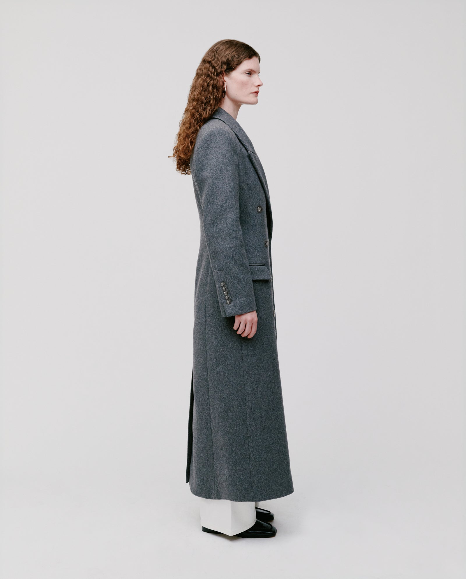A person in the IVY OAK CAROLINE ANN long black winter coat crafted from RWS-certified wool, layered over gray wide-leg pants, stands against a plain white background.A person models the IVY OAK CAROLINE ANN Coat, paired with a sweater, confidently facing the camera against a plain white background.