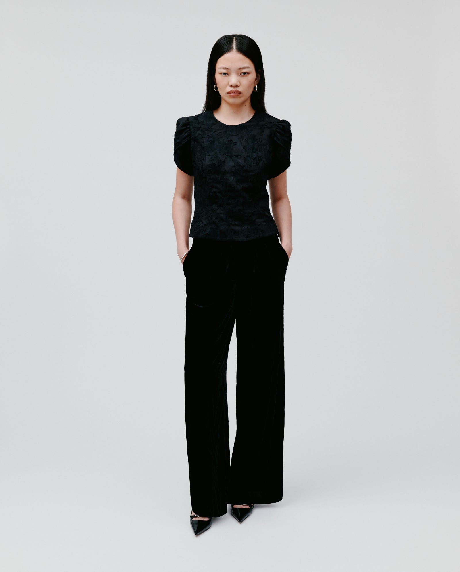 ELODIE is a refined fil coupé blouse designed with voluminous sleeves for a modern, romantic silhouette. A statement piece that effortlessly elevates any look.