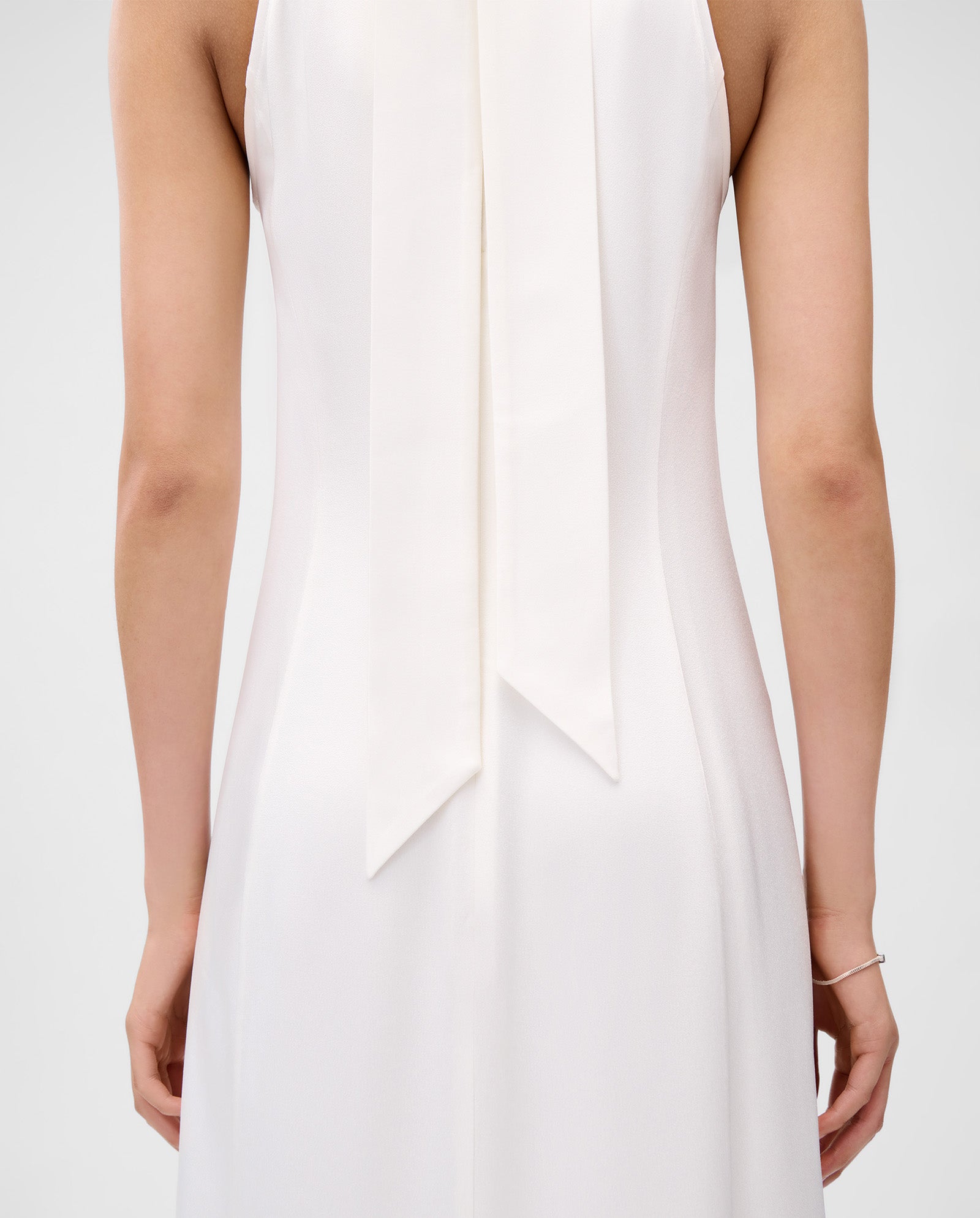 - Ties at neck, concealed zip fastening along back
