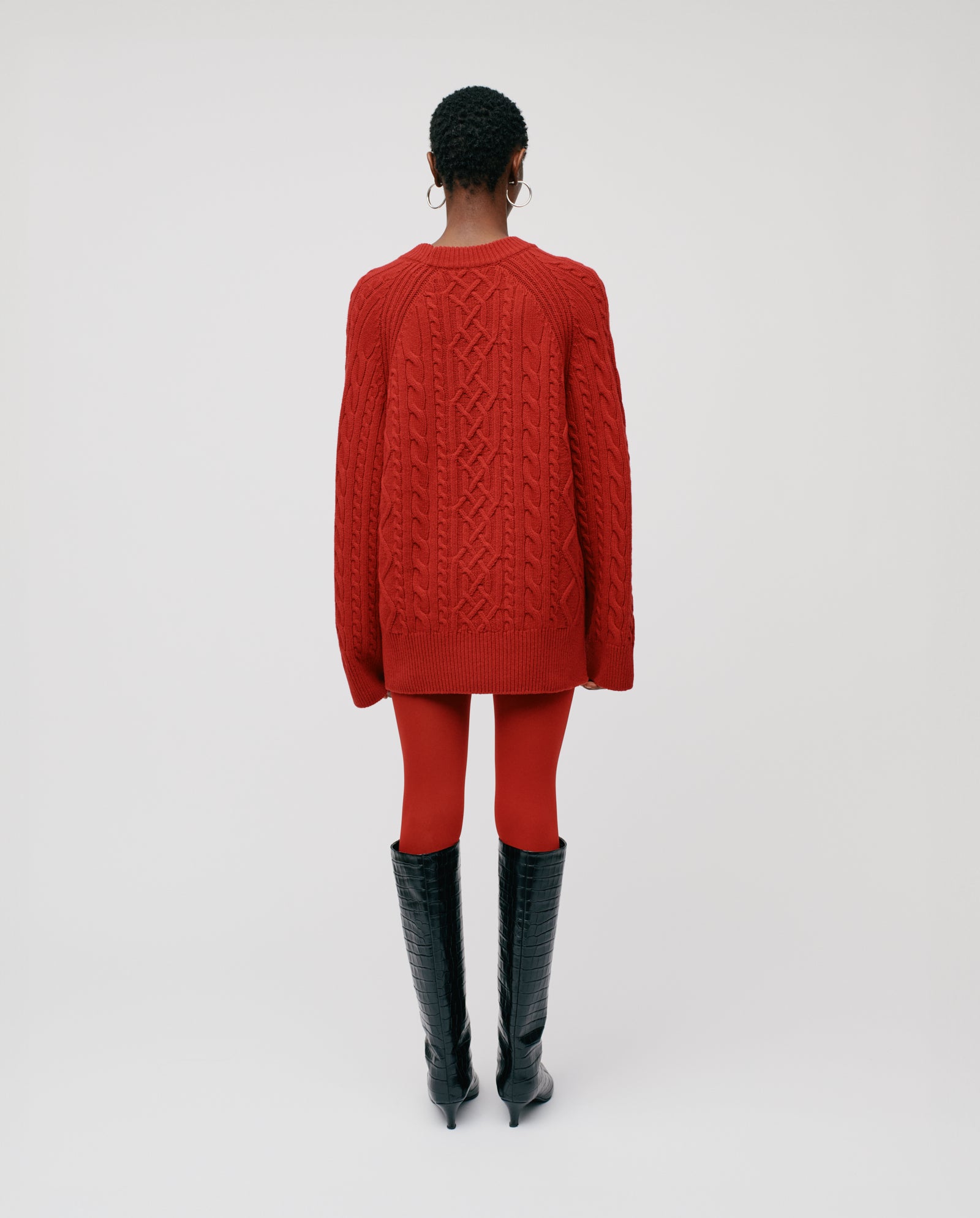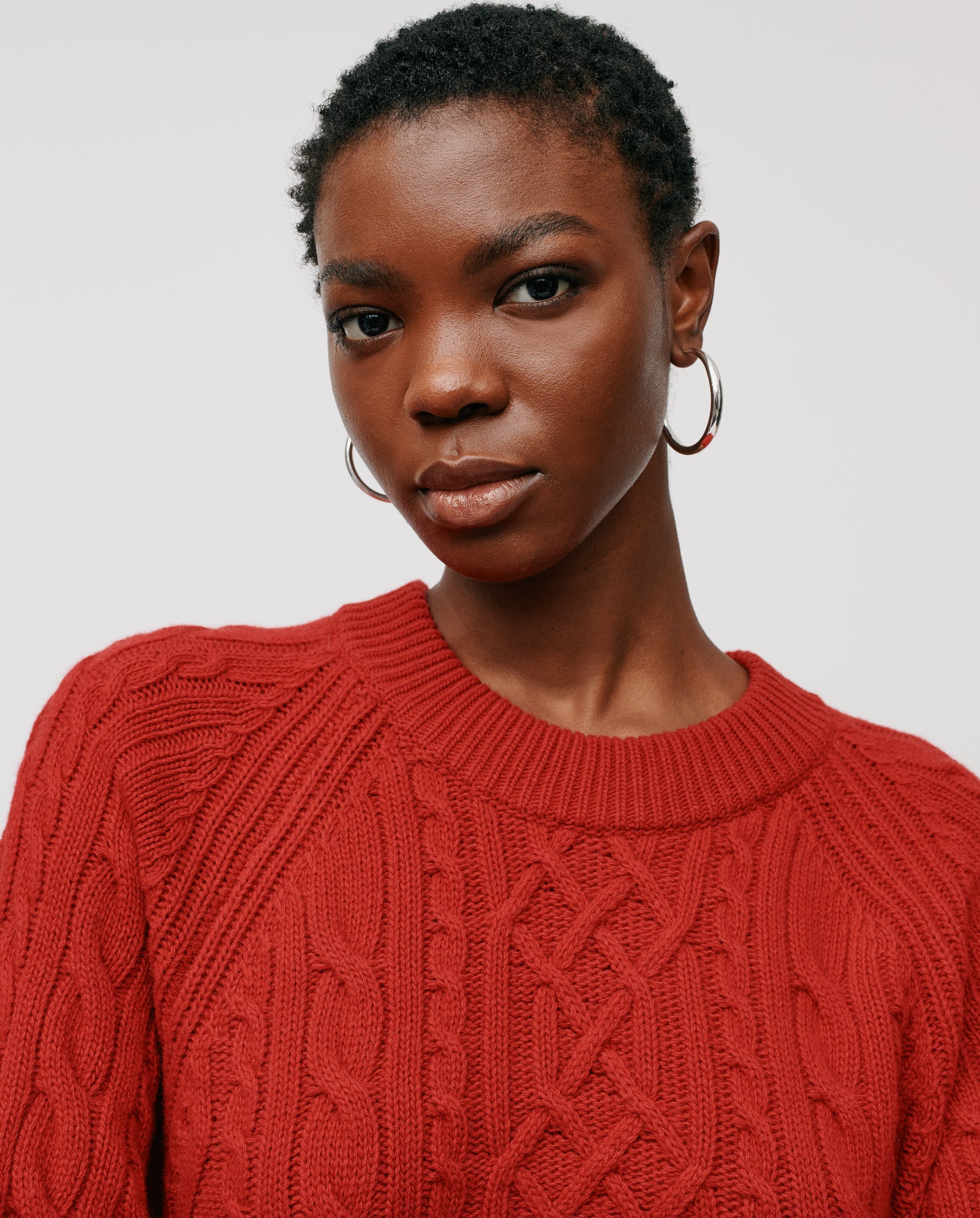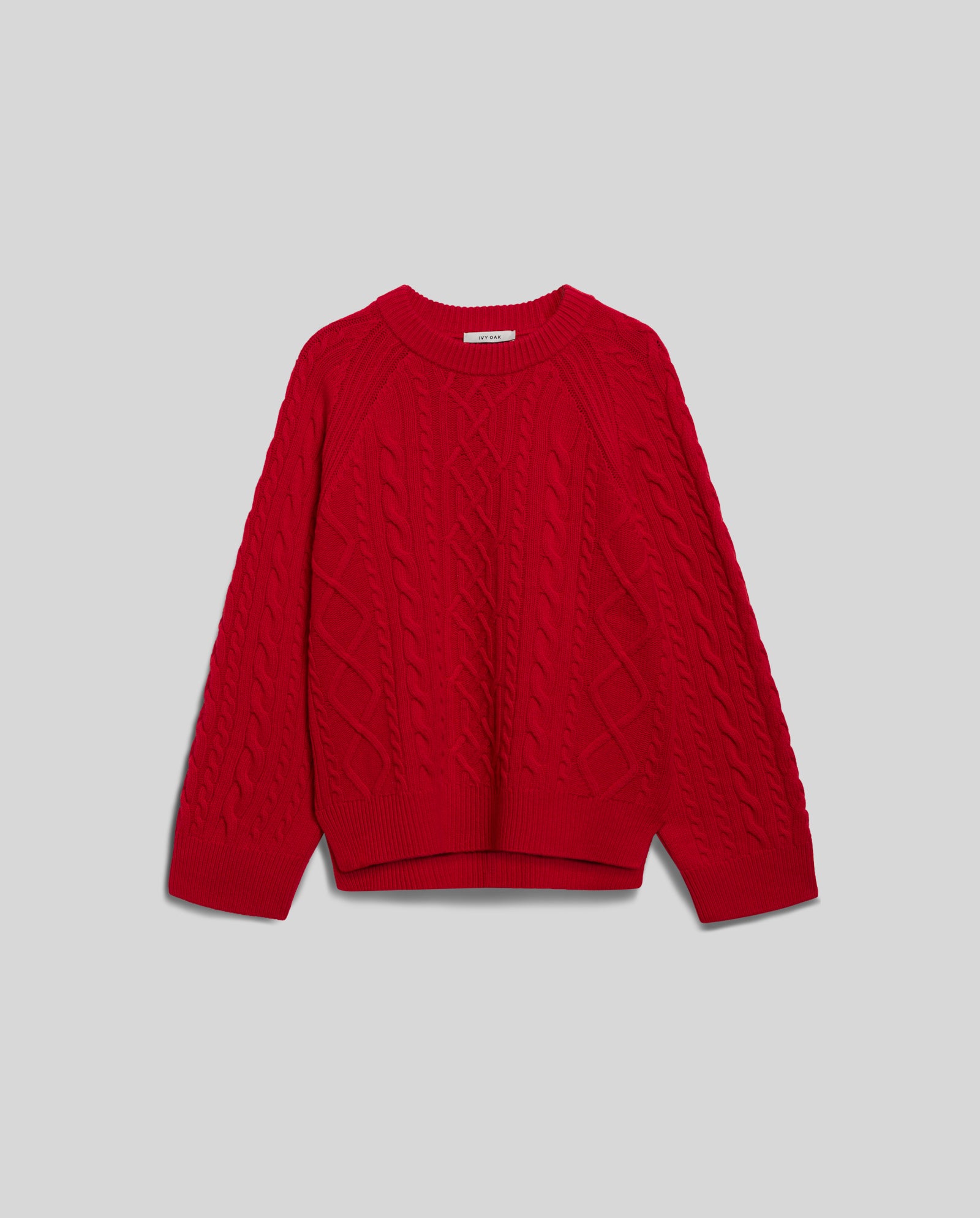 KLARINA ANN is a crewneck cable knit jumper with long and wide raglan sleeves and a ribbed collar, cuffs and hem.