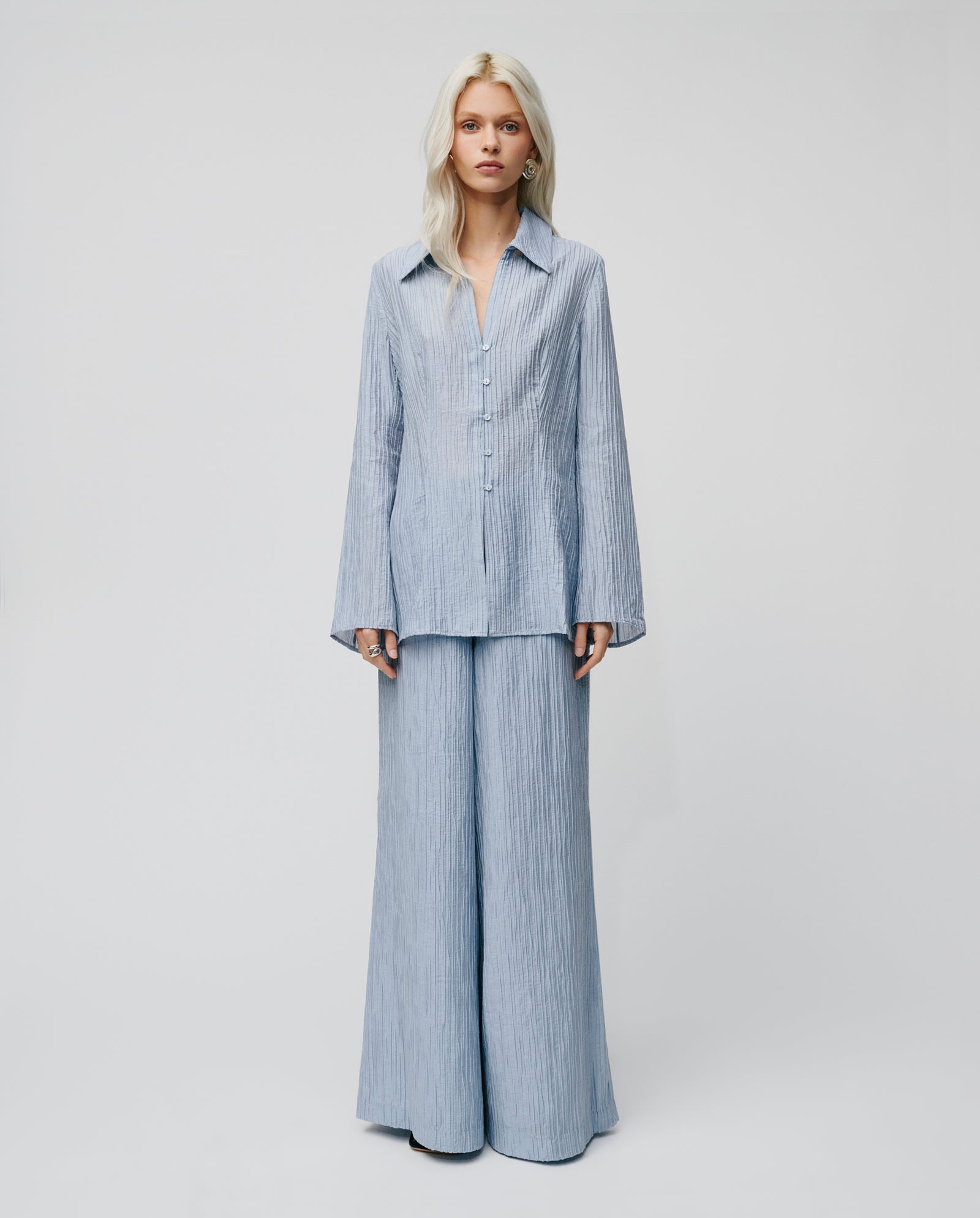 The PORTIA trousers are pleated palazzo trousers made of viscose. The EVELYN blouse is the perfect match for these trousers.
