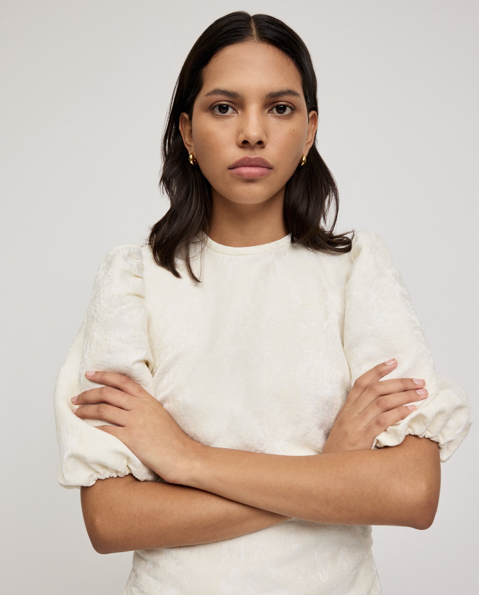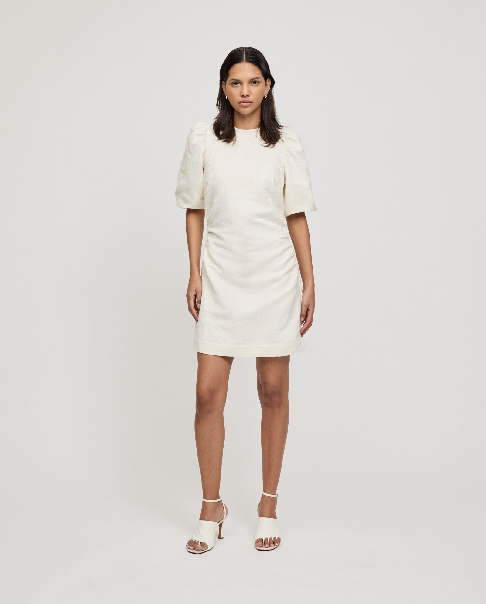 The NISSA jacquard mini dress with gathering details and puff sleeves.
