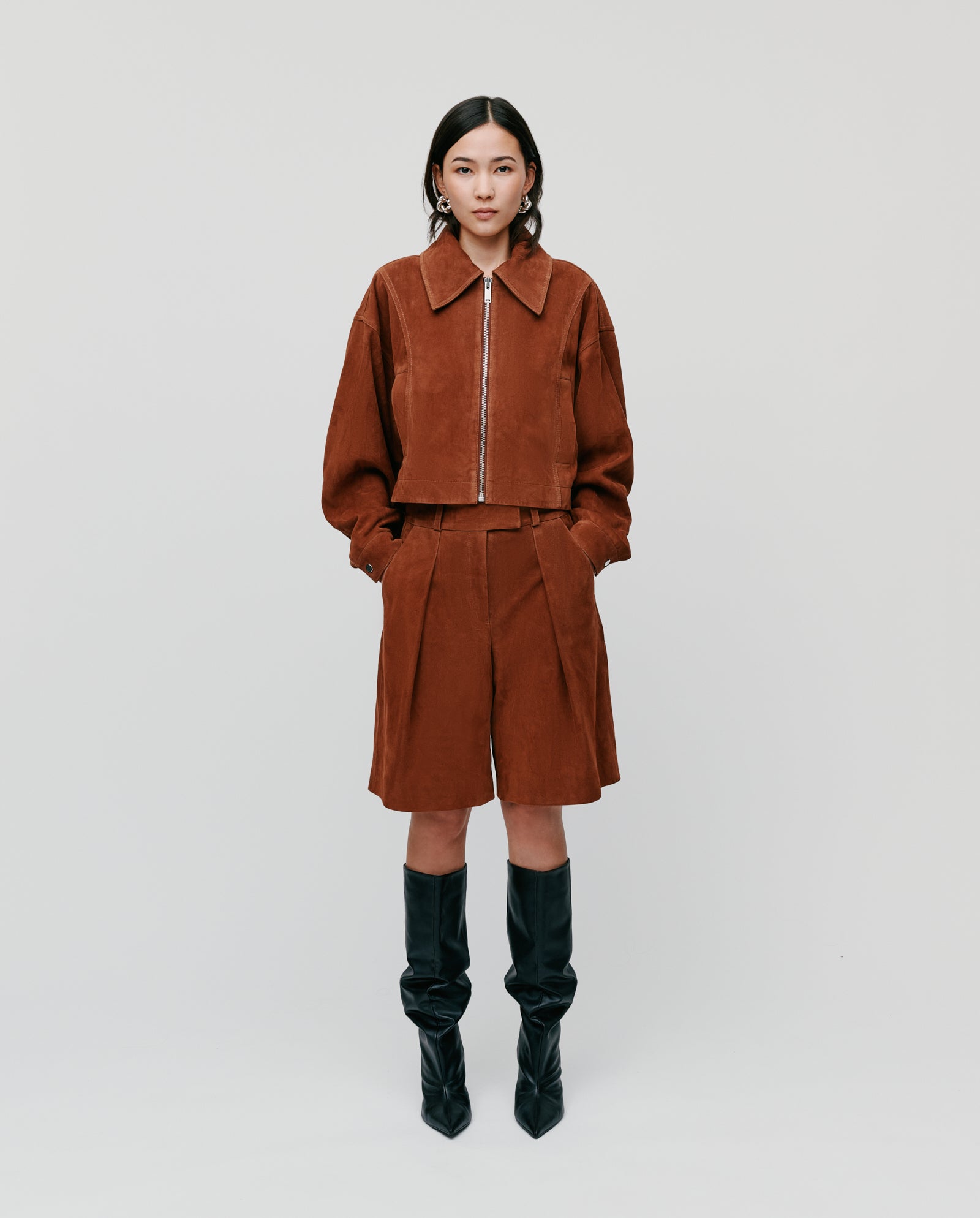 The LENA suede bomber jacket is a cropped boxy style with wide sleeves.
