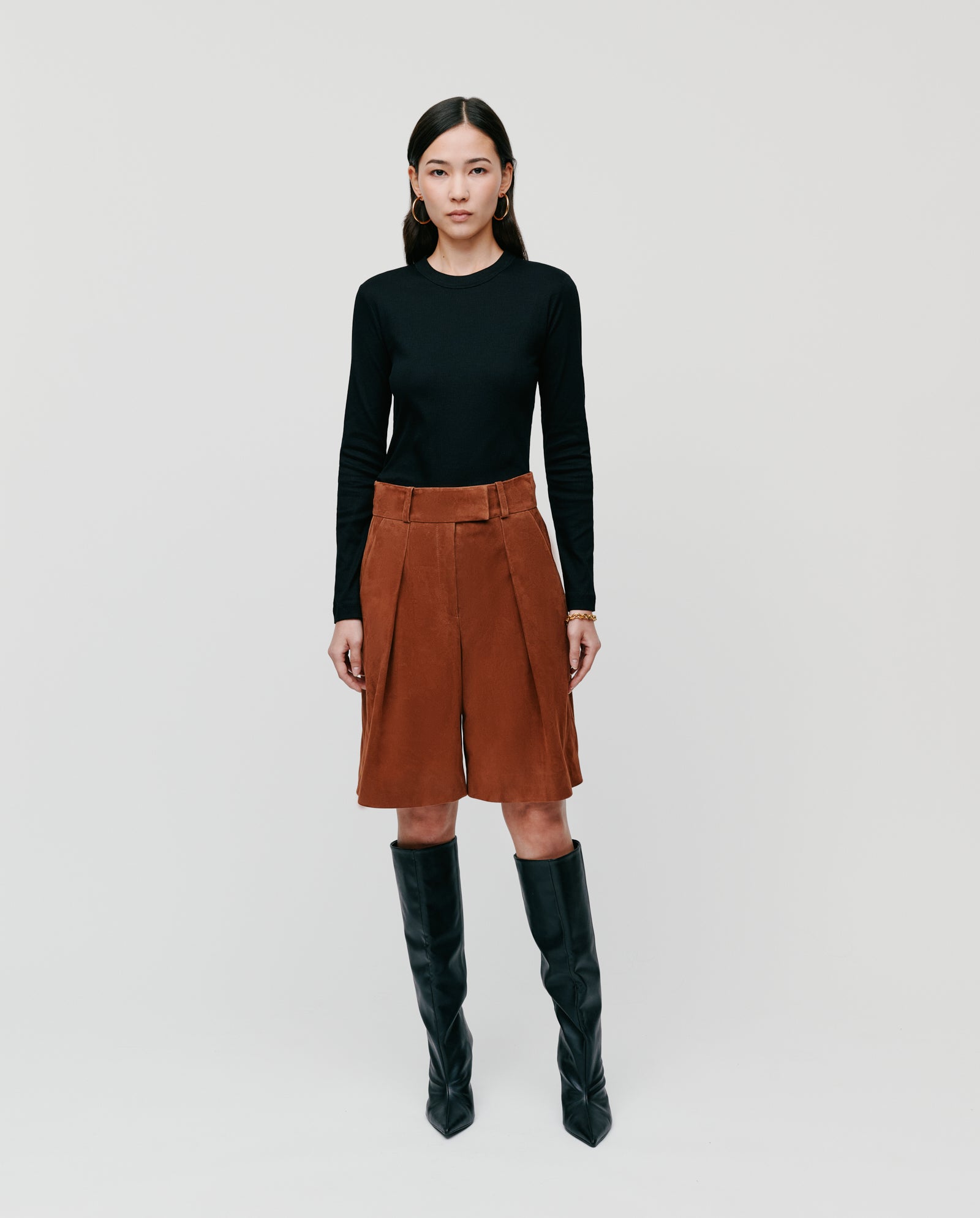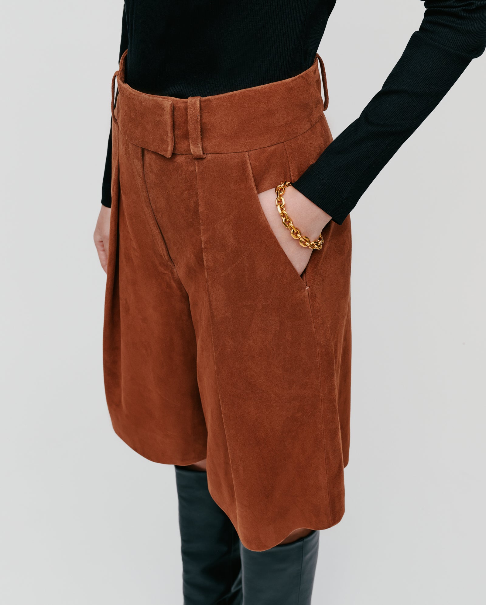 The LEA pants are suede Bermuda shorts with pleat details. They have a clean, classic look combined with the soft feel of leather.