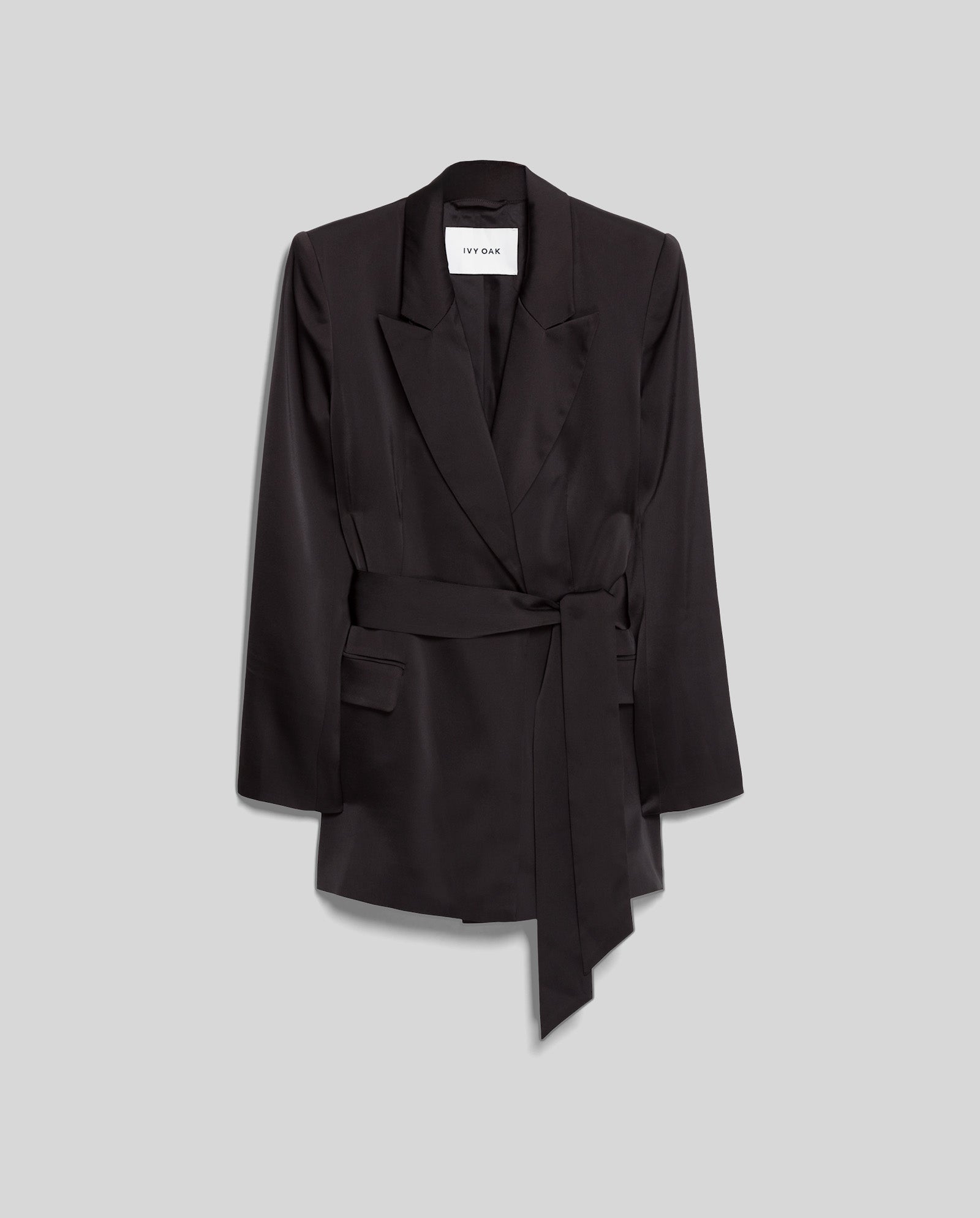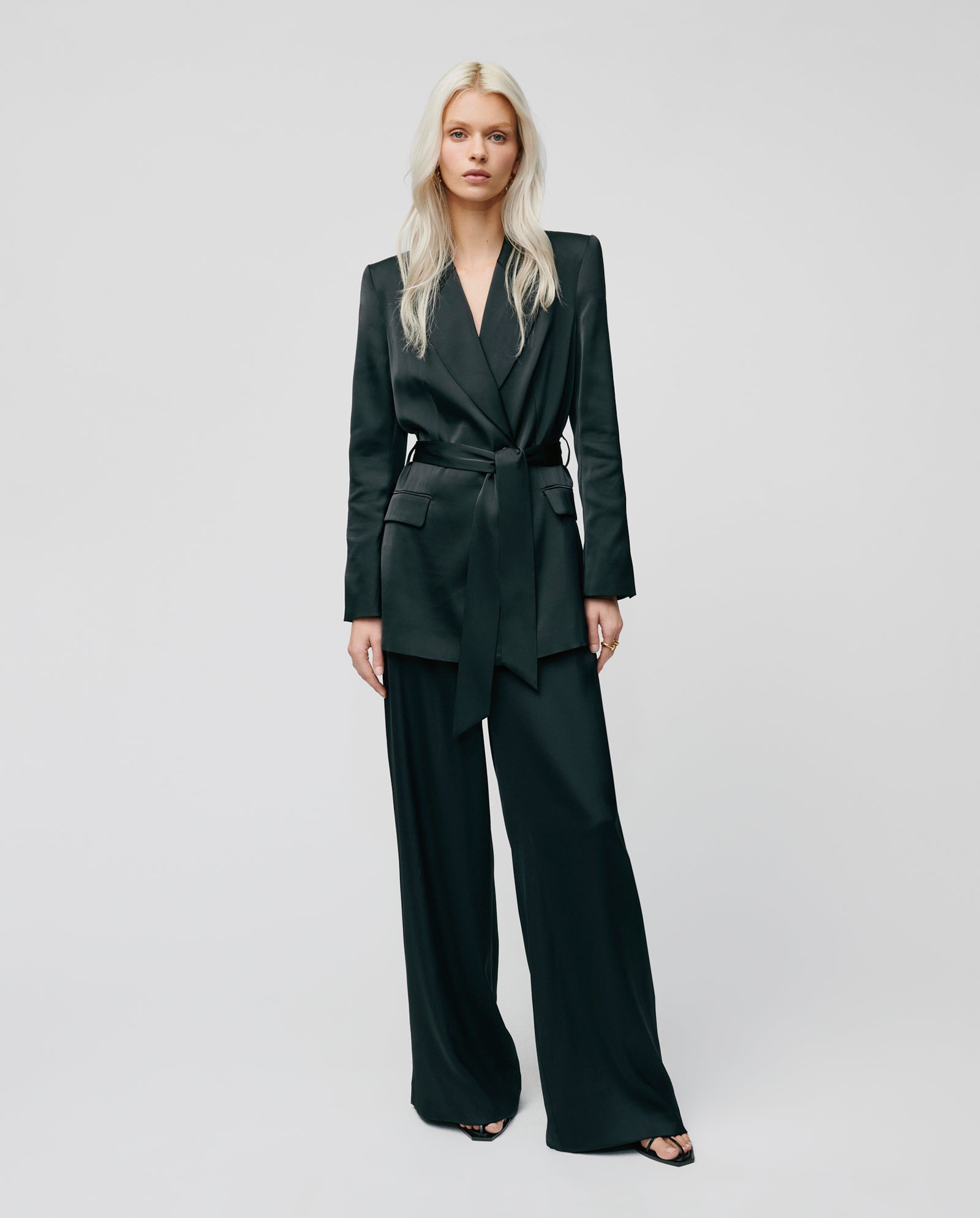 The JOSEPHINA blazer is made of delicate, shiny material. It has a peak lapel and a belt. The PRIYA ANN trousers are the perfect match for this blazer.