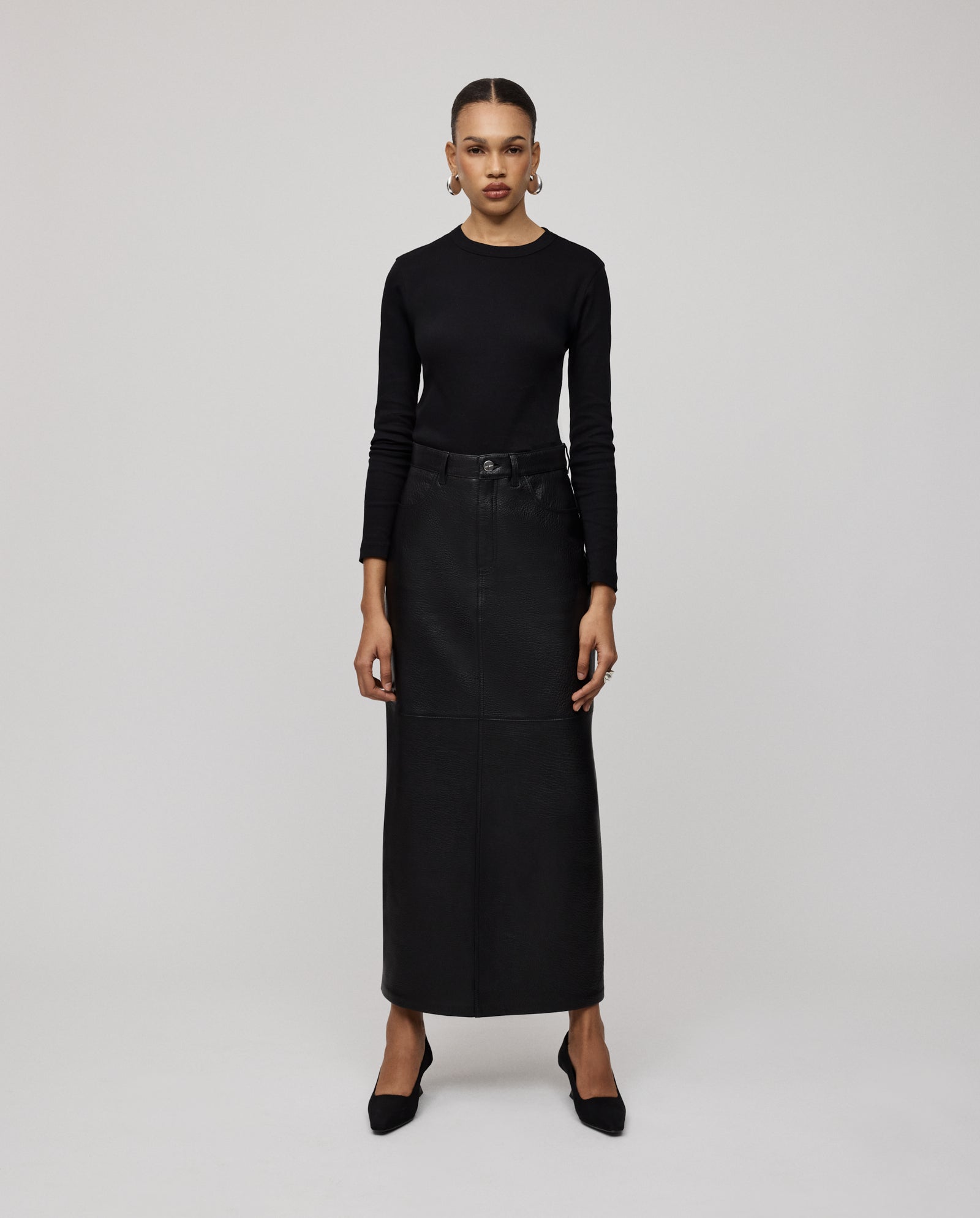 LISANNE is a ancle length skirt, made from a heavily grained premium hide that gives the garment a contrast to the fitted and light A-line silhouet. The design playes with classic denim pockets and yoke details.