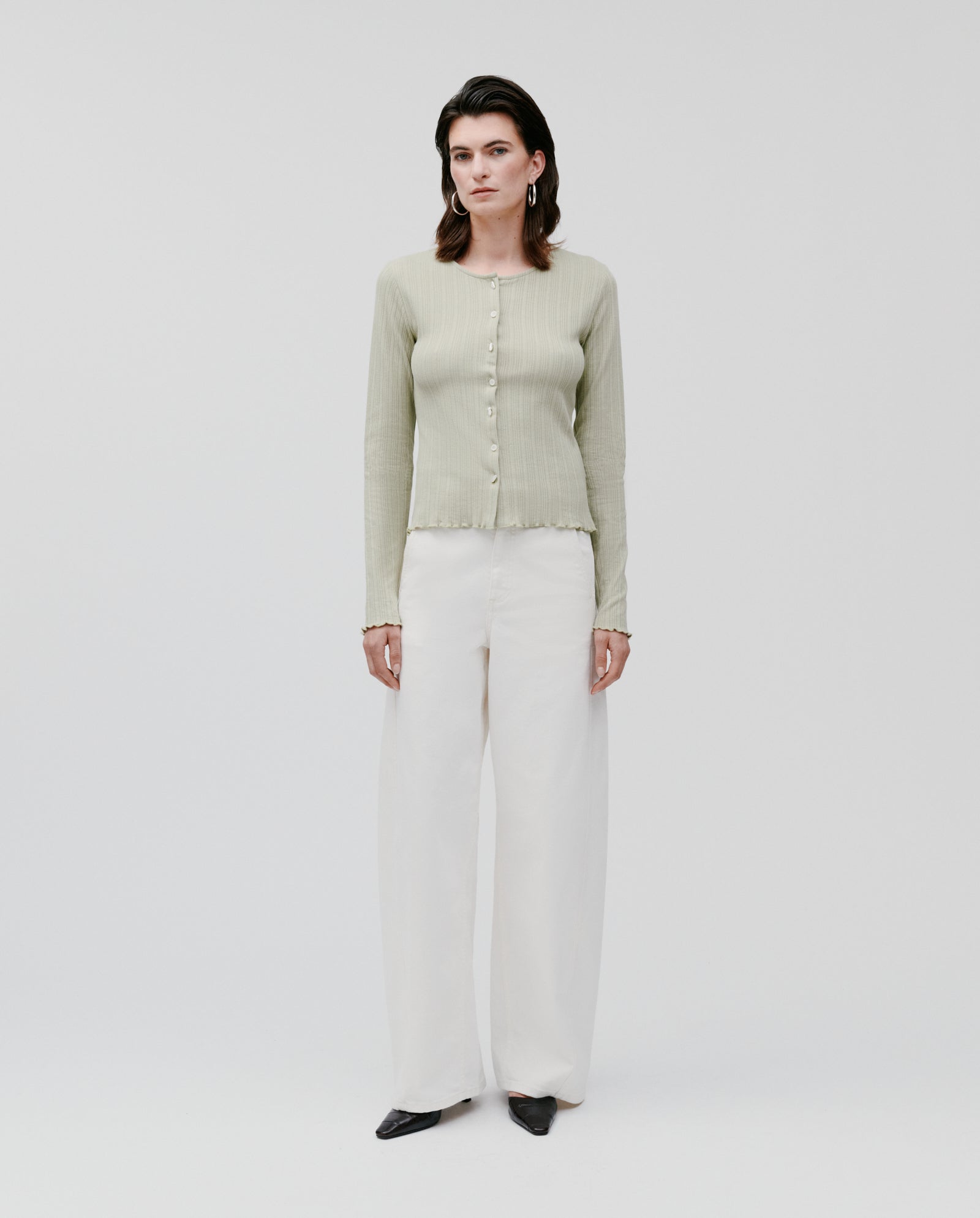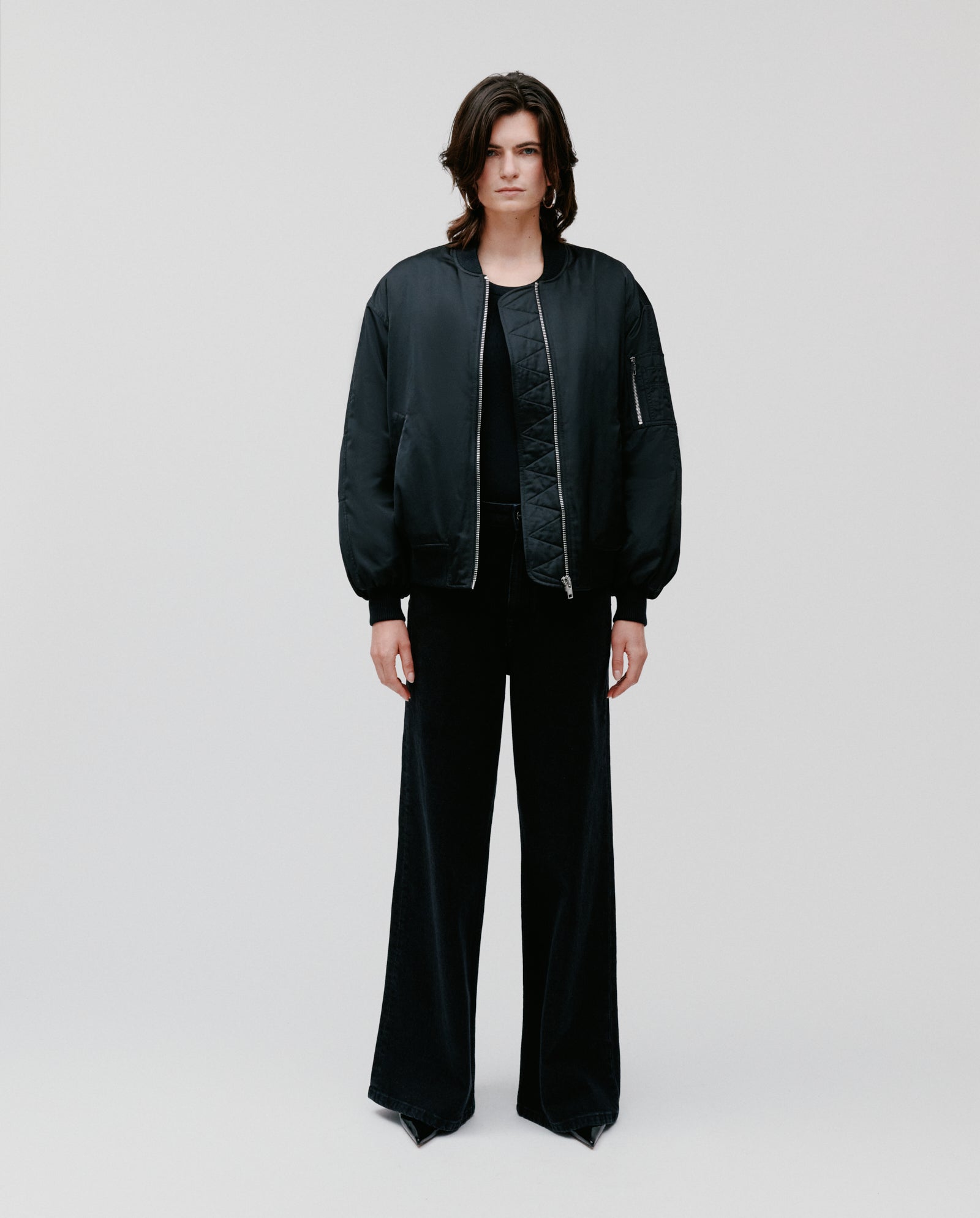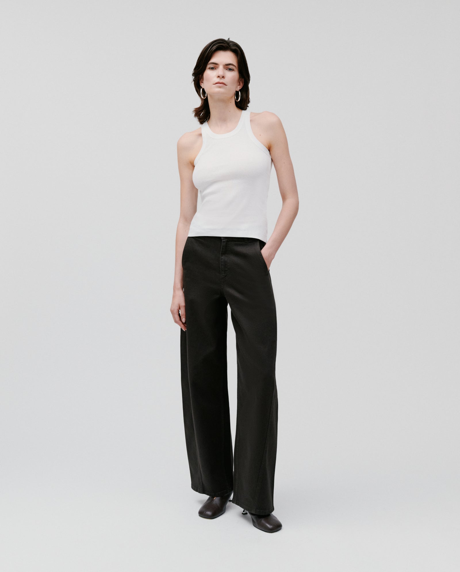 A person is wearing IVY OAK’s PHILINE SUE Pants—a minimalistic, wide-leg black trouser—styled with hands in pockets.A person wears IVY OAKs PHILINE SUE Pants—minimalistic wide-leg trousers in black crepe fabric—with a sleeveless top, standing against a plain light background.
