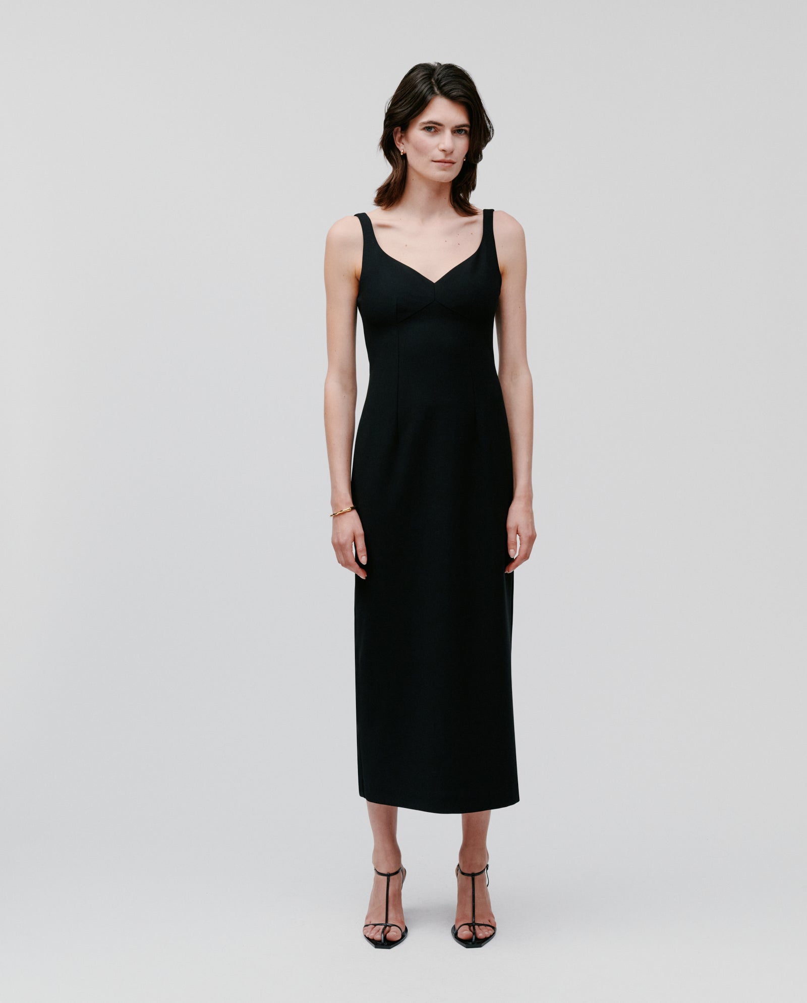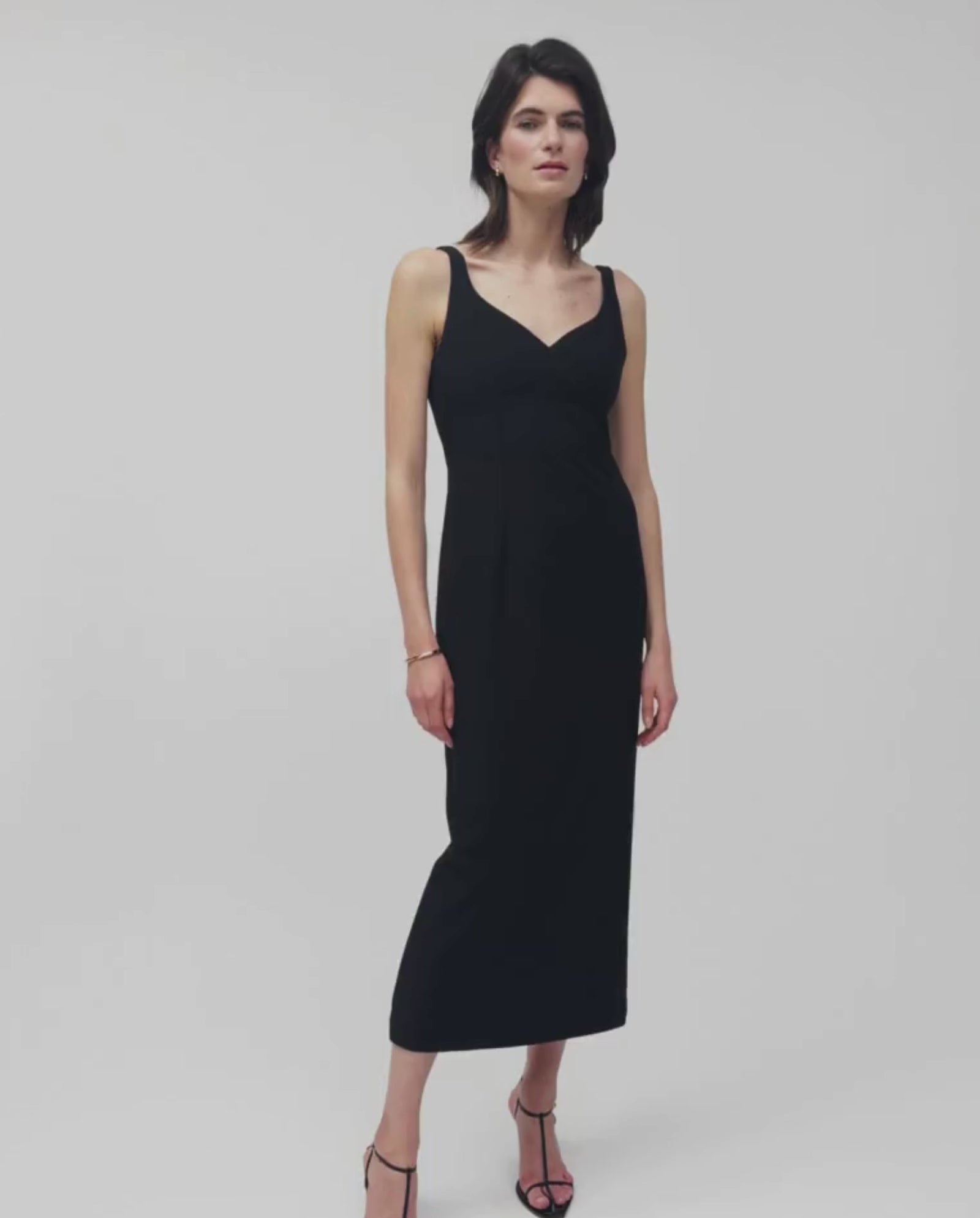 The ankle-length NEPHELIA dress is made from a matte material and has a long slit at the back. Seam design in top shape the silhouette.