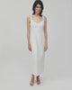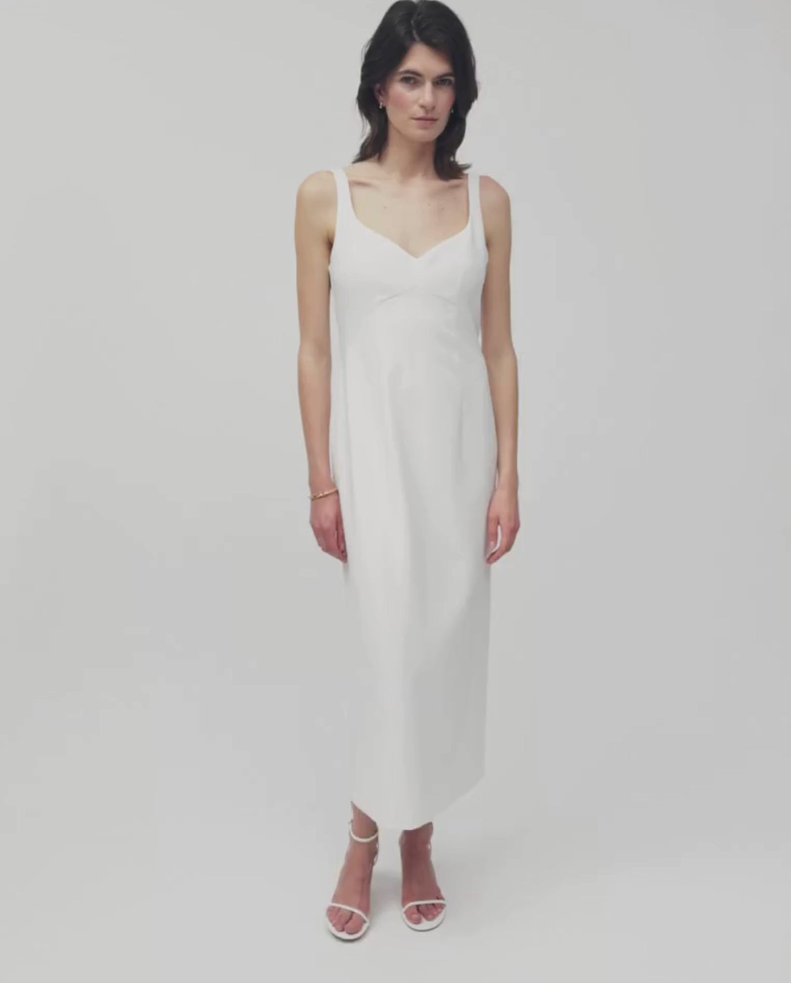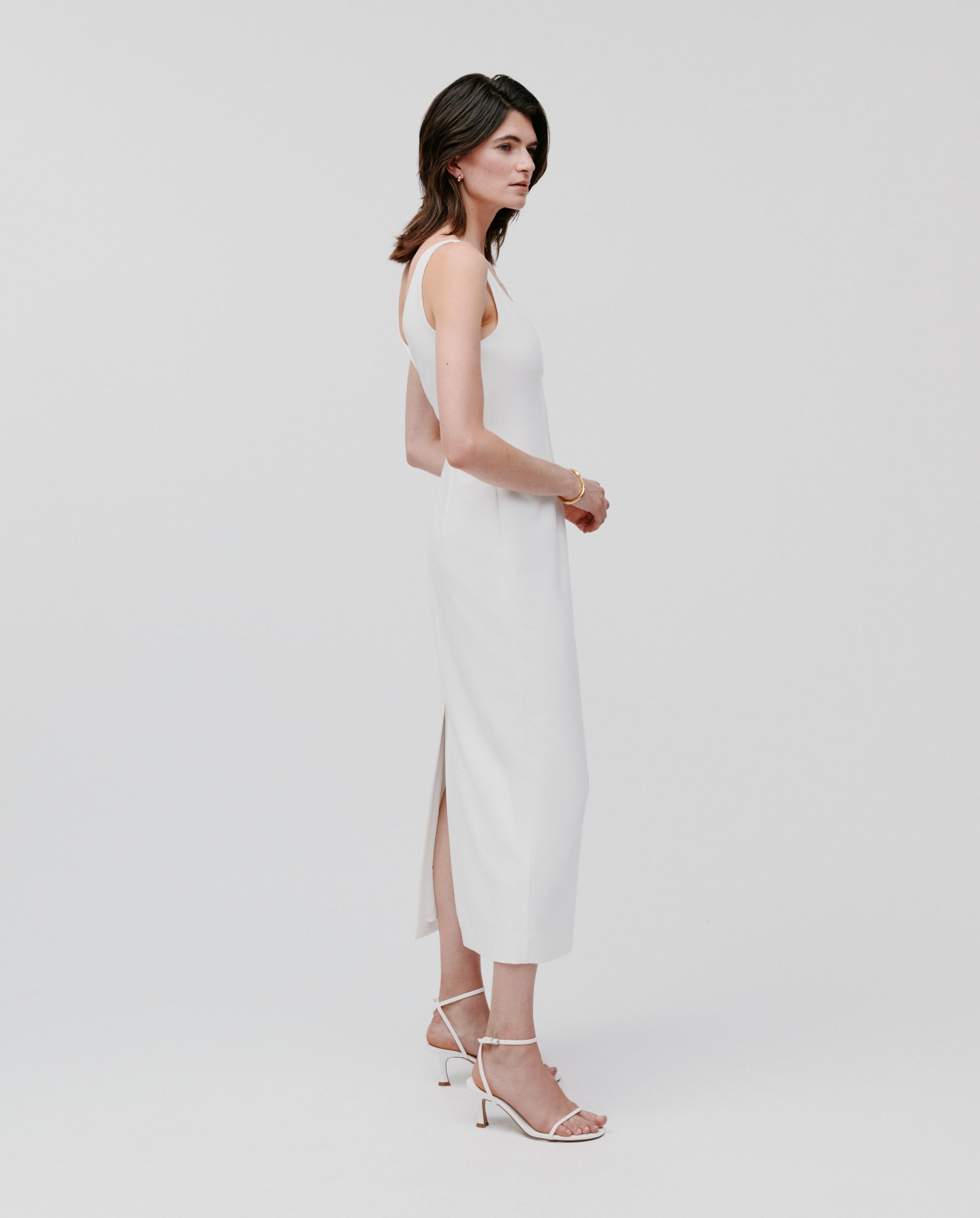 The ankle-length NEPHELIA dress is made from a matte material and has a long slit at the back. Seam design in top shape the silhouette.