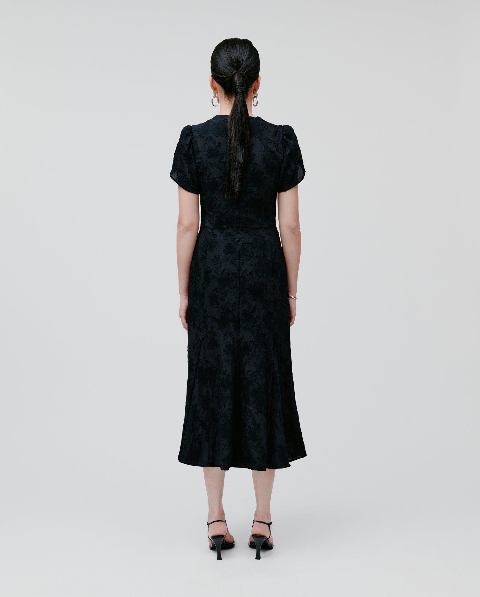 NASRIN is a midi fil coupé dress featuring short, flower-shaped sleeves. The fitted bodice highlights the silhouette, while the softly flared hem adds a playful, feminine touch.