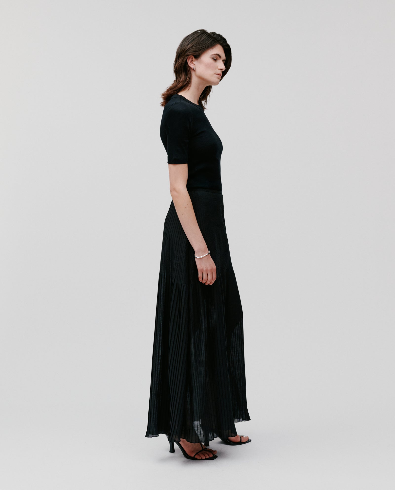 SALENA is a summerish skirt that lives from the simplicity yet special detailing of the luxury plissé fabric. Closing the pleats with a multiple topstitching detail create the skirts´ silhouet.
