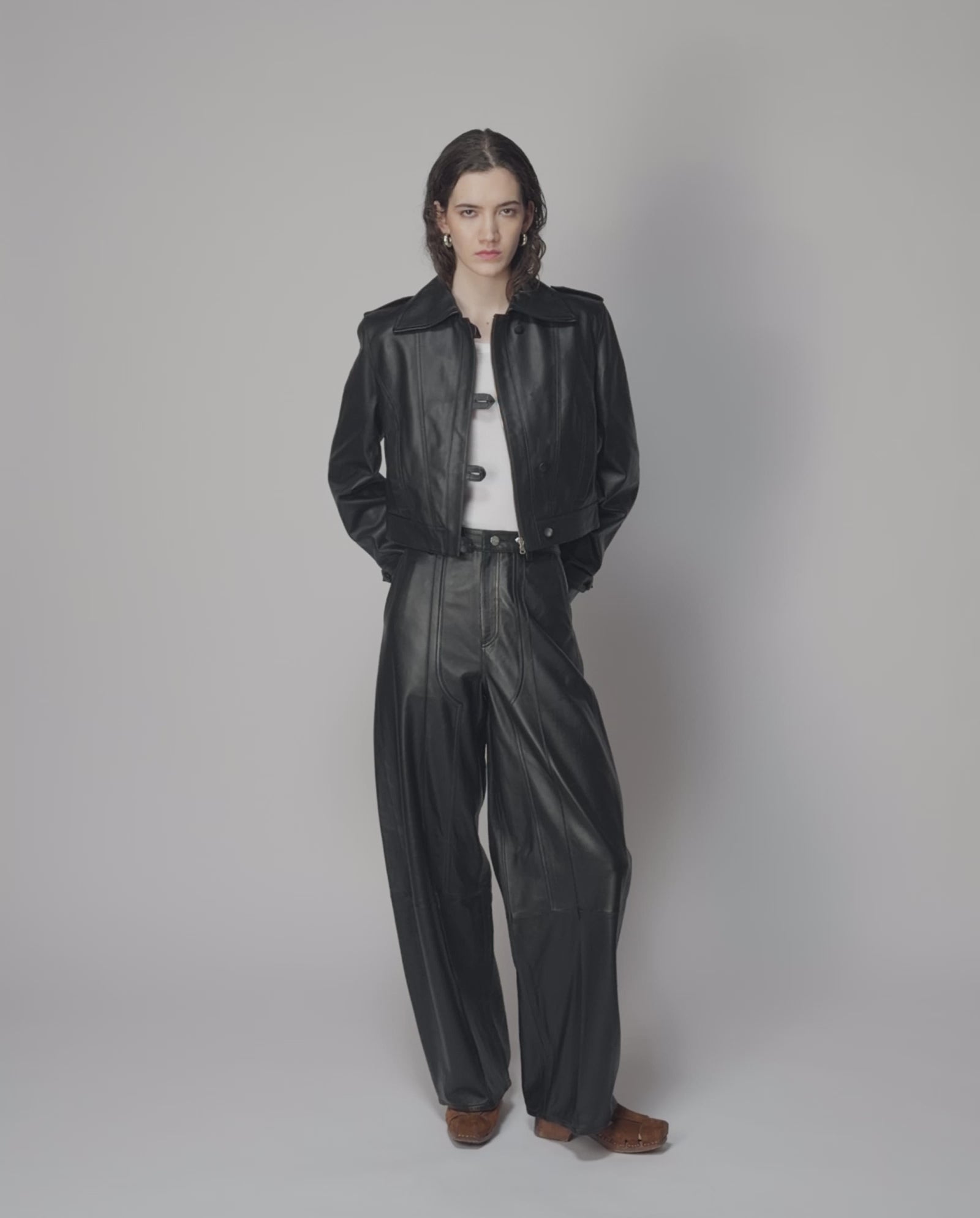 The LESLIE leather pants feature a barrel leg silhouette. Front pintucks create a refined contrast to the patch-look detailing on the front leg and classic 5-pocket denim-inspired elements.