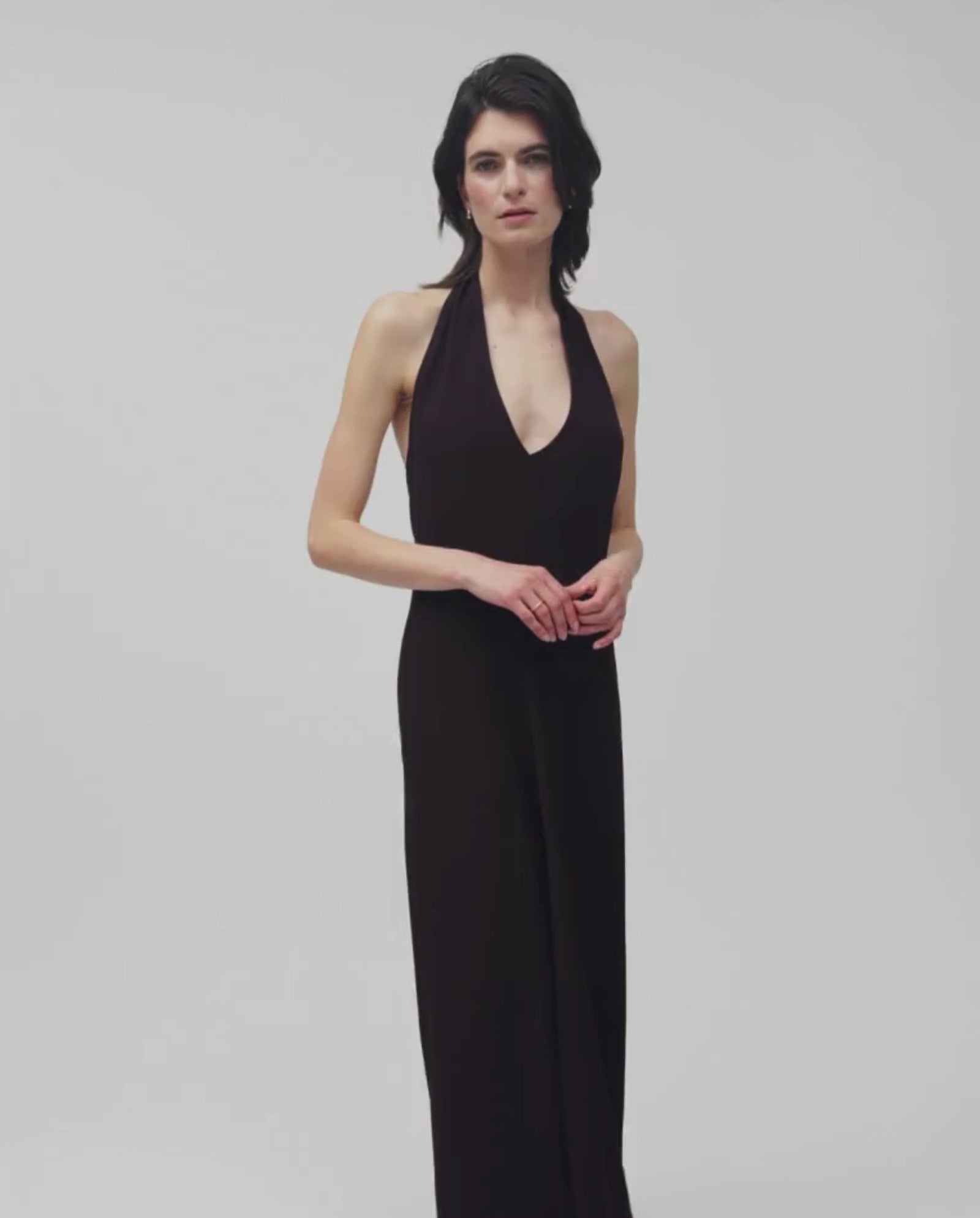NESTA is a neckholder dress made of crepe fabric with distinctively crisp and crimped appearance.
